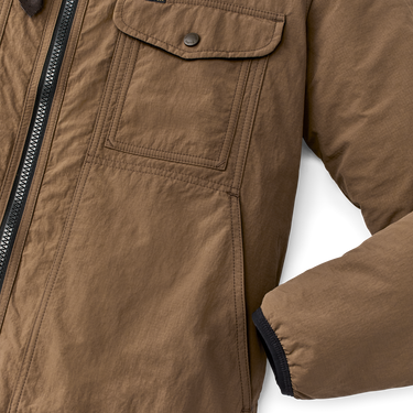 Both sides feature hand pockets for convenience. The nylon side adds a flapped chest pocket and a zippered stow pocket for essentials. An elastic hem and cuffs seal in body heat, while the full front zipper makes for easy on and off.