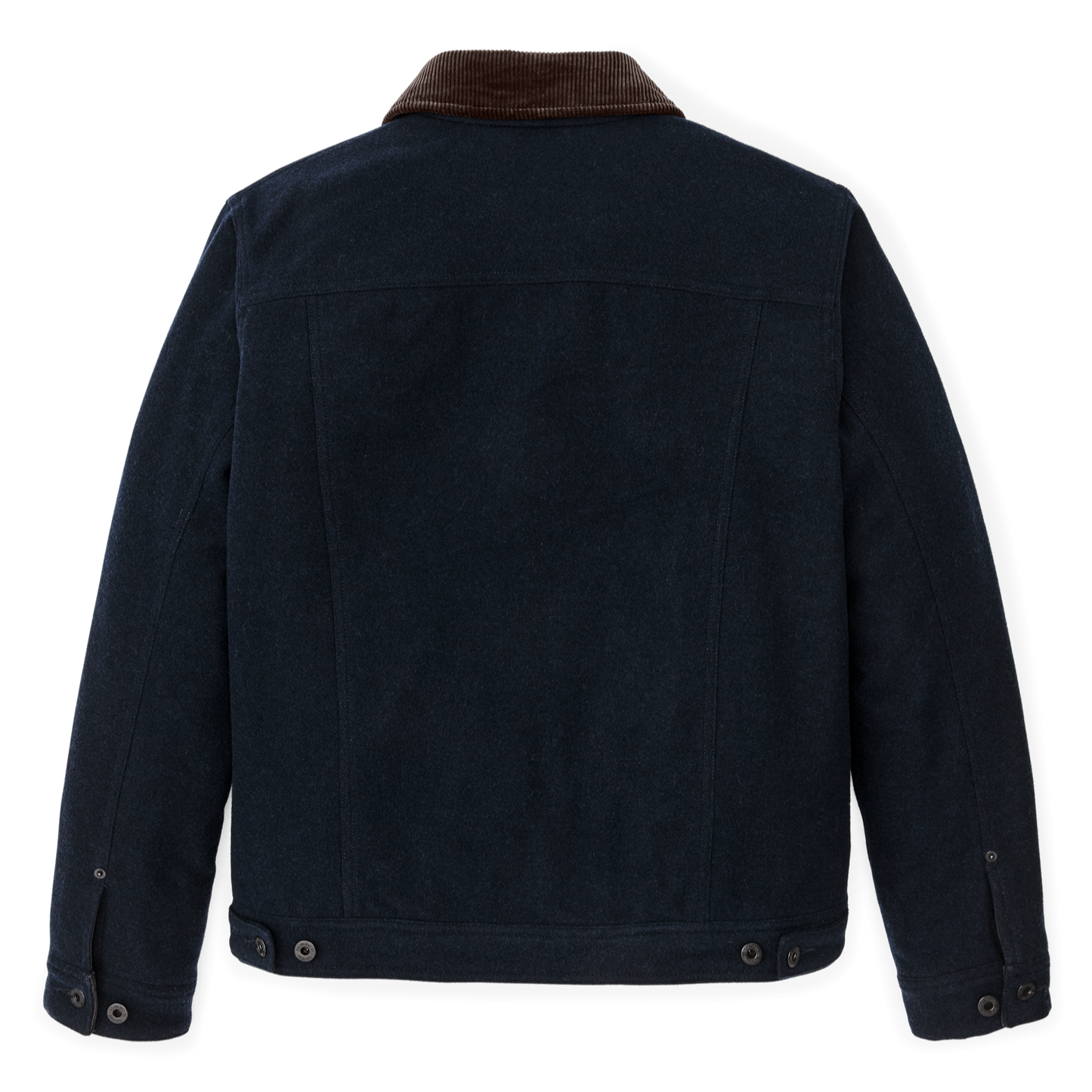 Metal-shank buttons secure the front, cuffs, and waist tabs. Corduroy at the collar and cuffs adds comfort. Chest pockets keep tools and essentials close; large front pockets warm hands and carry more.