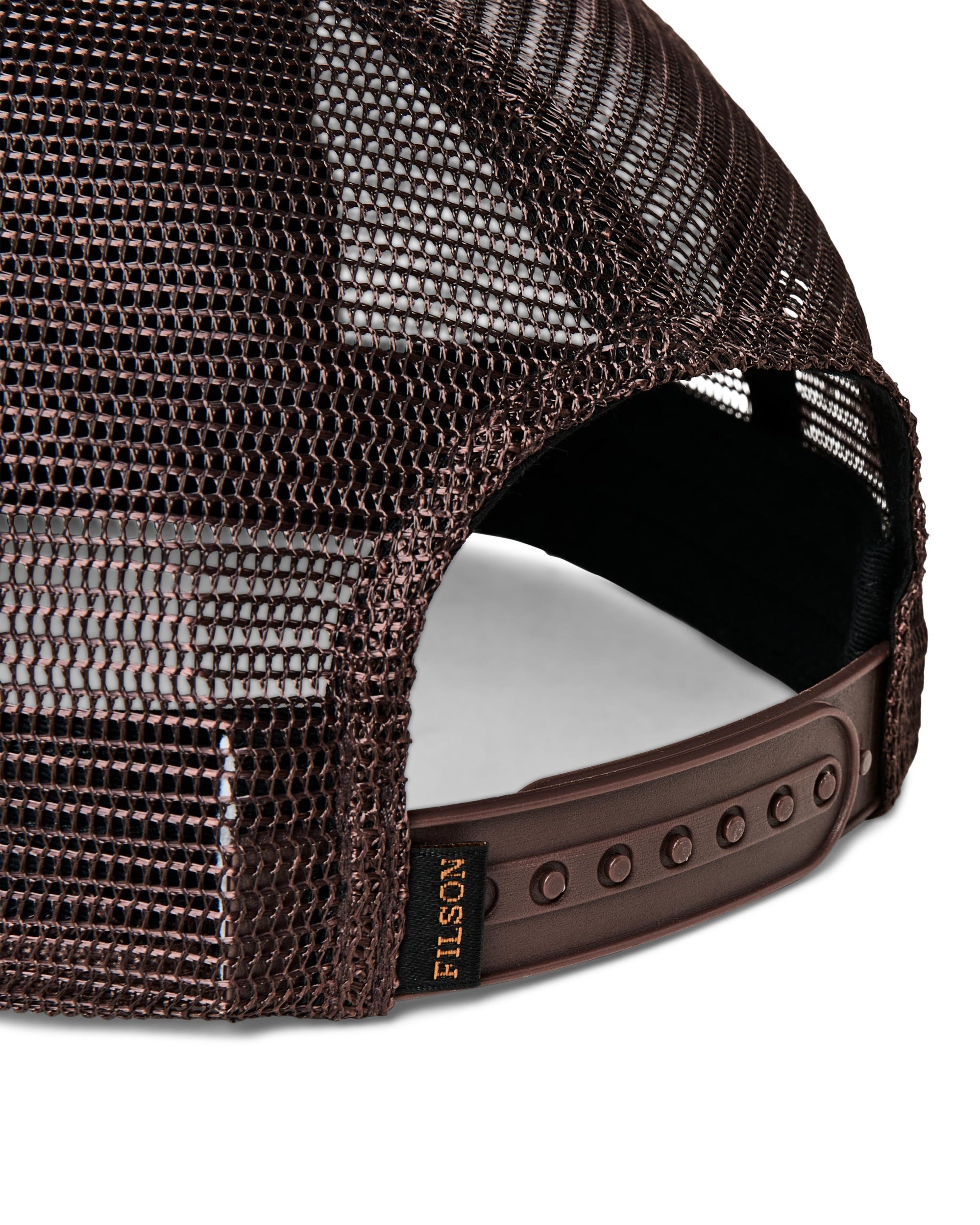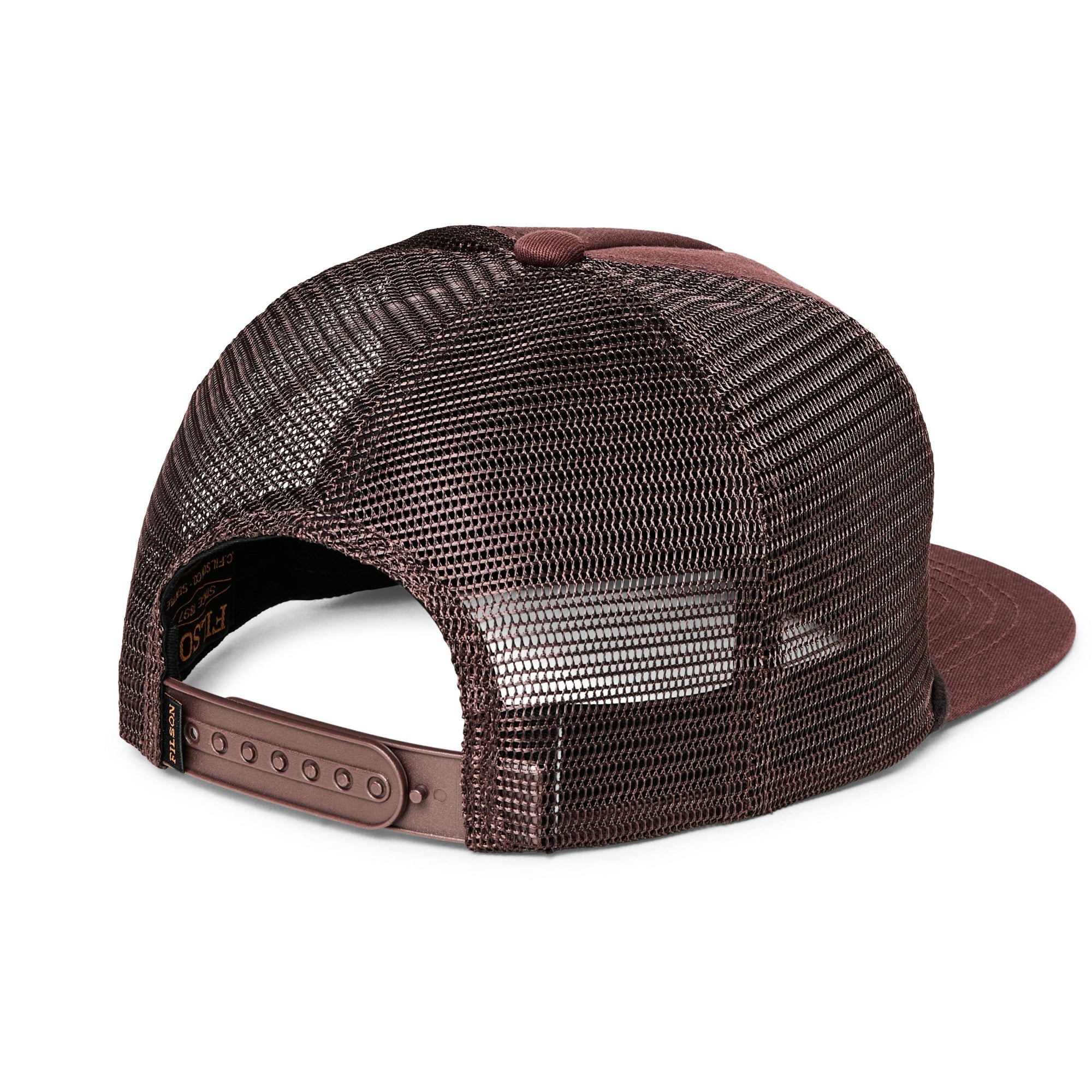Like the trucker hats of the 1970s, this 5-panel cap is made with a pinched front crown and a flat brim. Mesh back and side panels provide excellent ventilation in the heat. Rope trim hides the joint of the front panel and brim, and the adjustable plastic back strap assures a custom fit. Classic embroidered Filson logo patch on front.