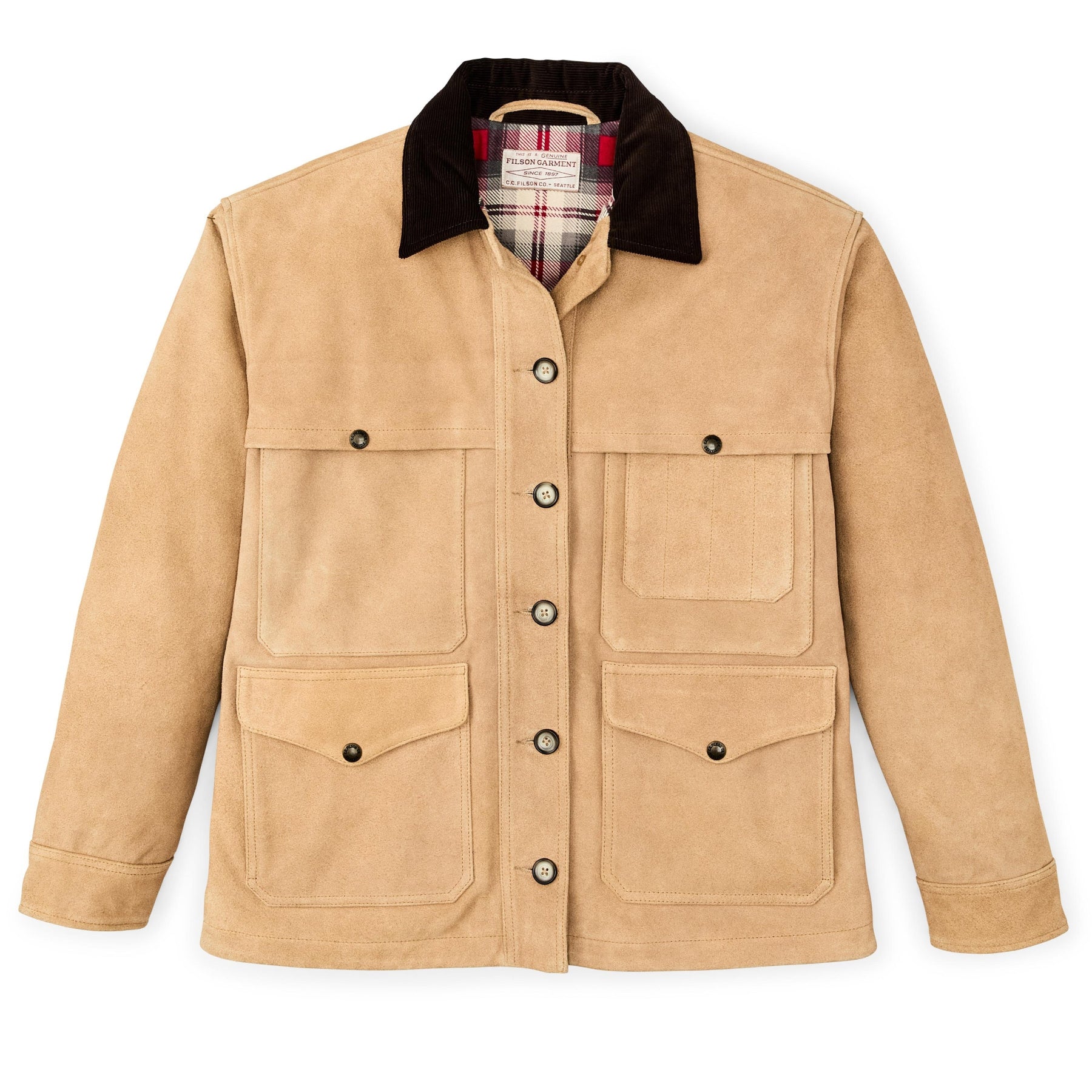 Inside, brushed-cotton flannel lines the body comfort through the seasons. Four snap-flap front pockets keep essentials close at hand, and classic button closures finish the front and cuffs.
