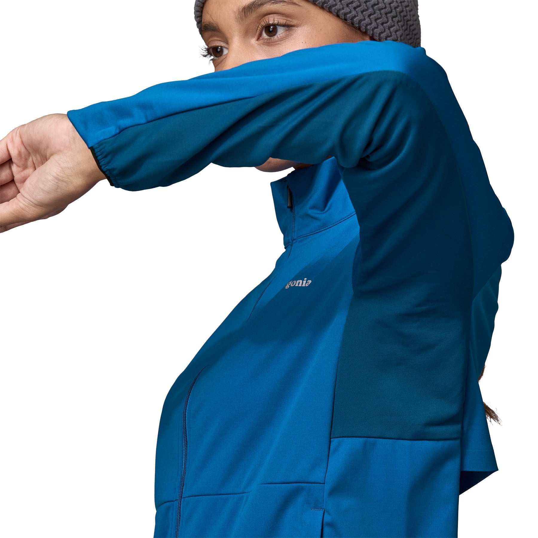 • Stretchy soft-shell fabric wards off wind, and a durable water repellent (DWR) finish that's made without intentionally added PFAS resists light precipitation; Capilene® Cool Lightweight fabric bonded to the inside provides fast-drying comfort and a soft next-to-skin feel