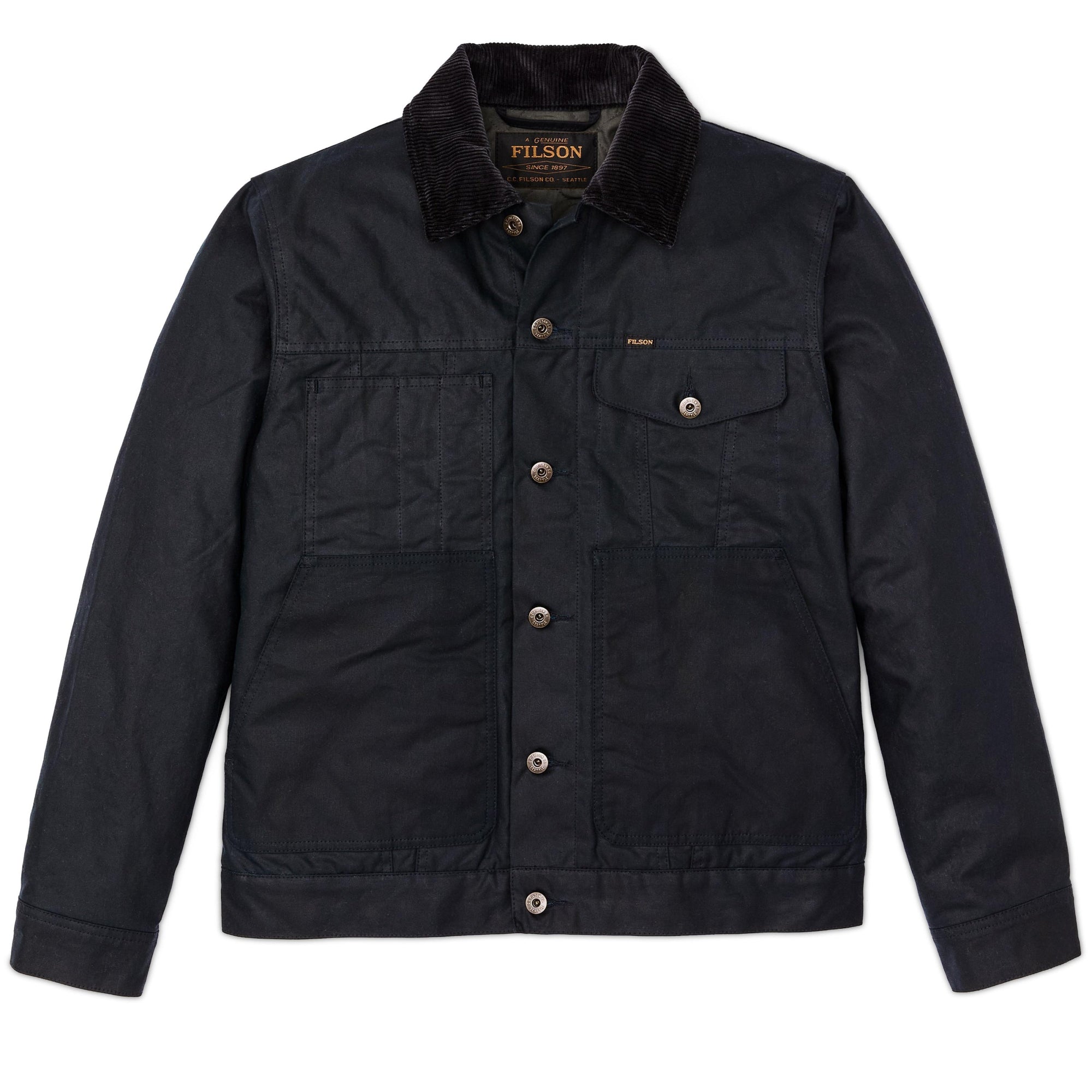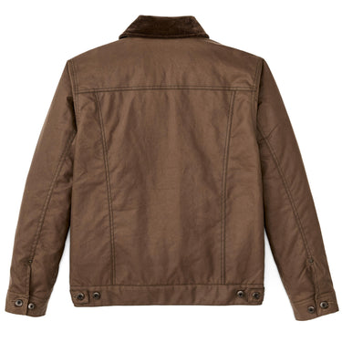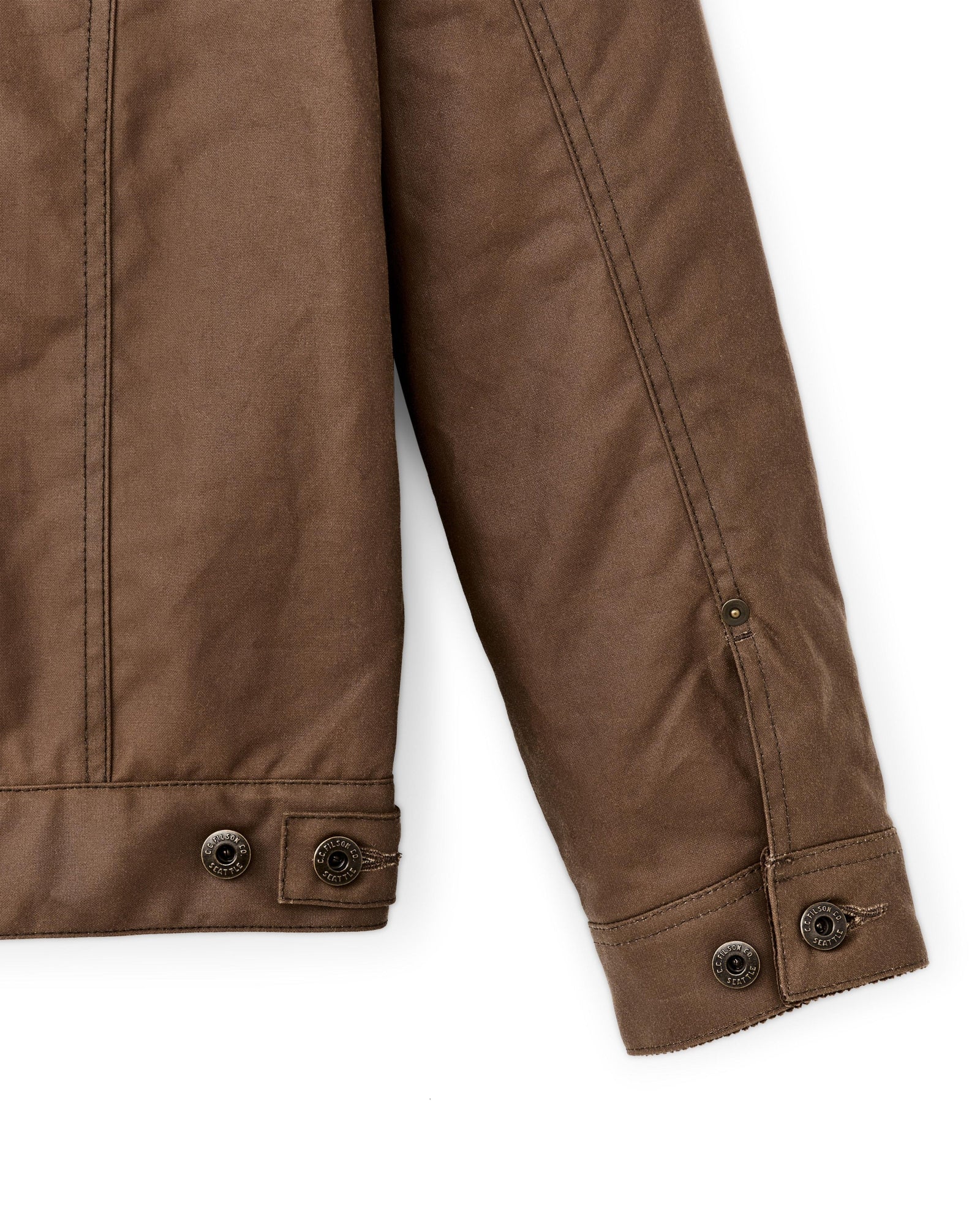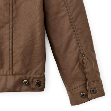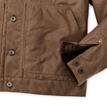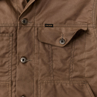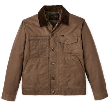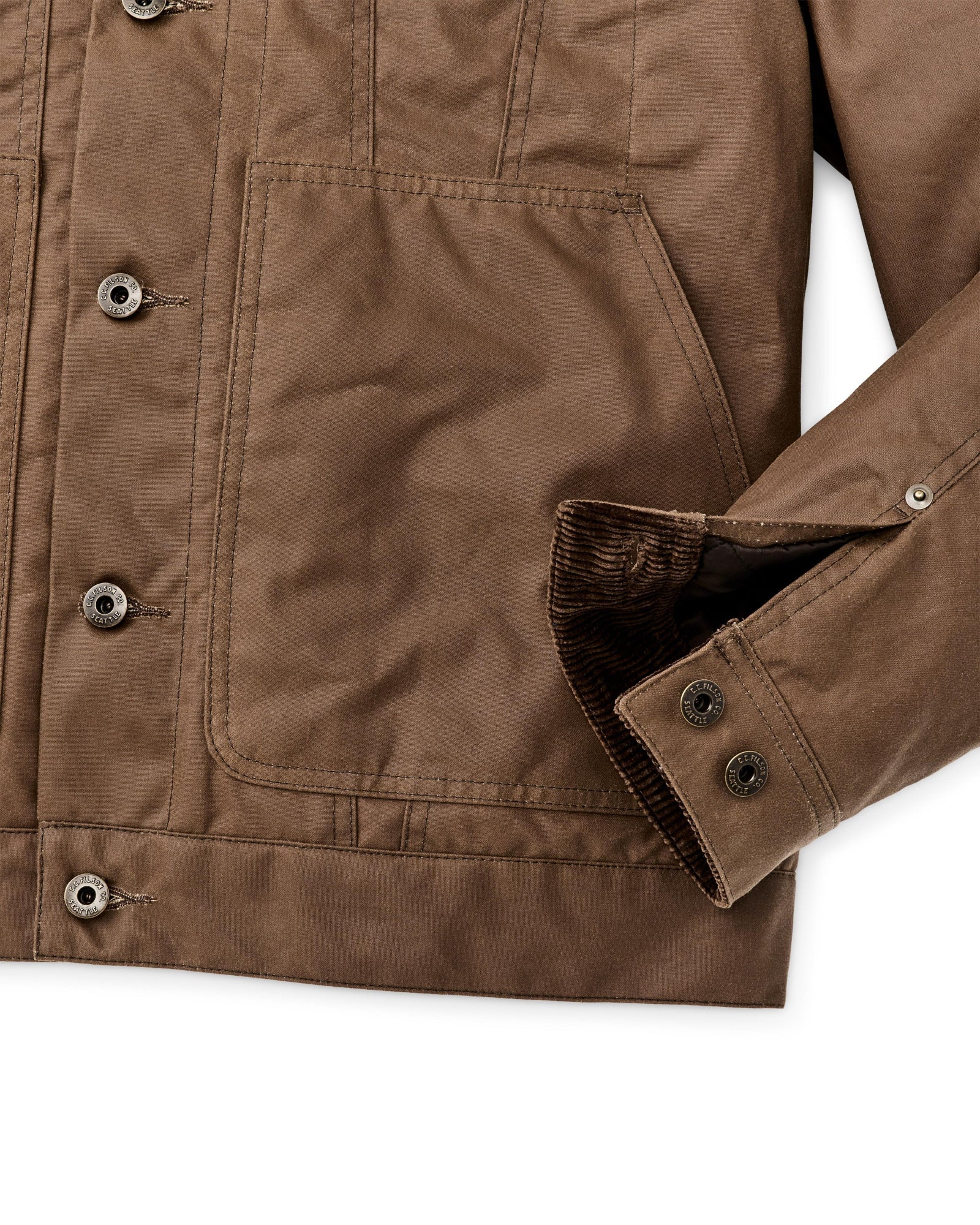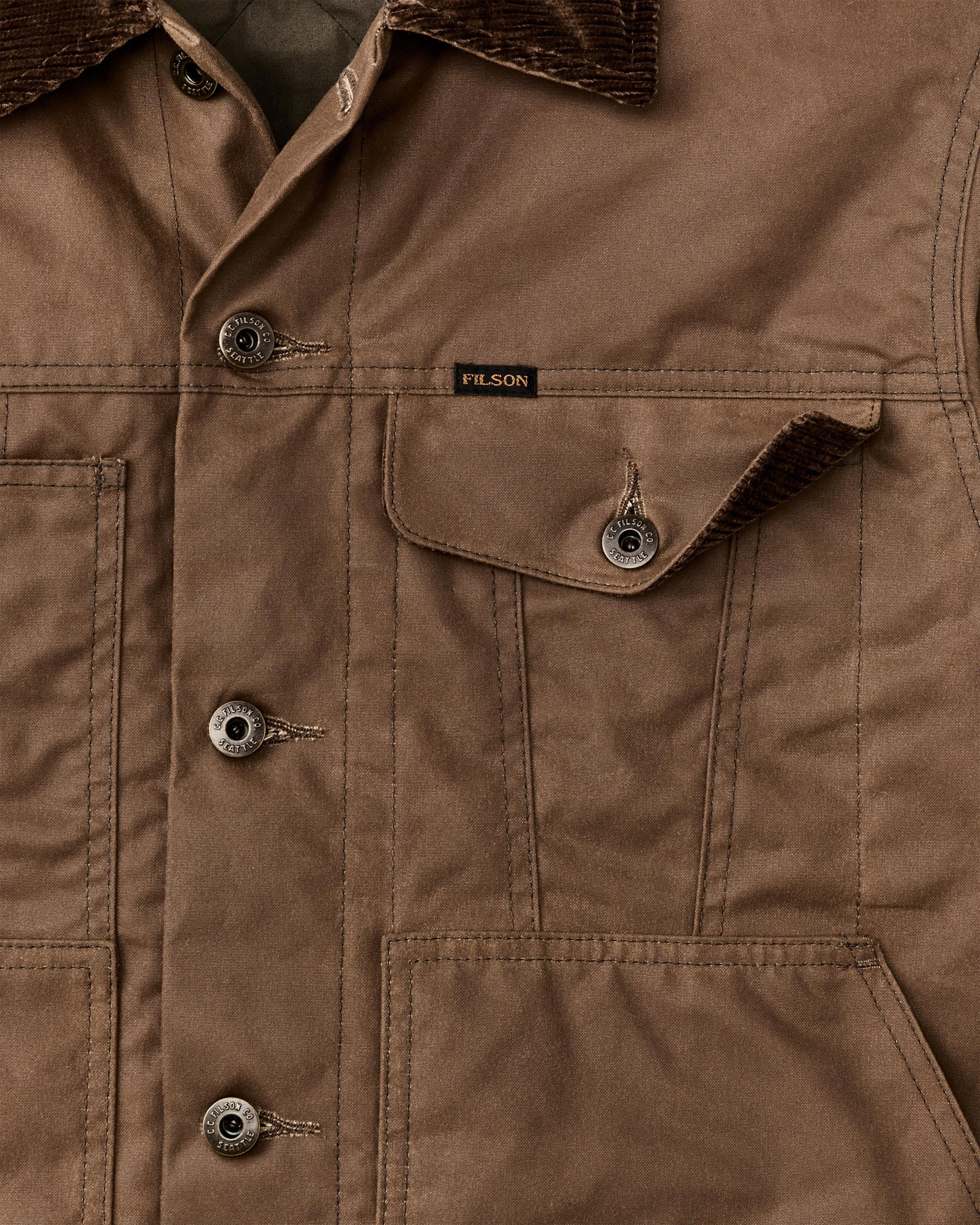 The Insulated Short Cruiser is made with our signature Shelter Cloth waxed cotton. At 11-oz. per square yard, this fabric is midweight for Filson, yet still heavier-duty than its imitators. Strong and flexible, Shelter Cloth comes from England's famed British Millerain, waxed-cotton pioneers since 1880. The PrimaLoft insulation is lightweight and will continue to trap heat even if it gets wet. The collar and cuffs are lined with 100% cotton corduroy for comfort against the skin. Virtually unbreakable metal-shank buttons secure the front closure and waist-adjustment tabs. Large hand pockets plus flapped and slotted chest pockets.