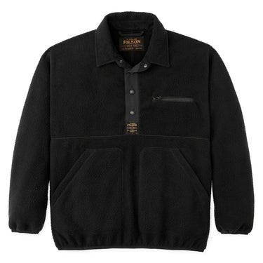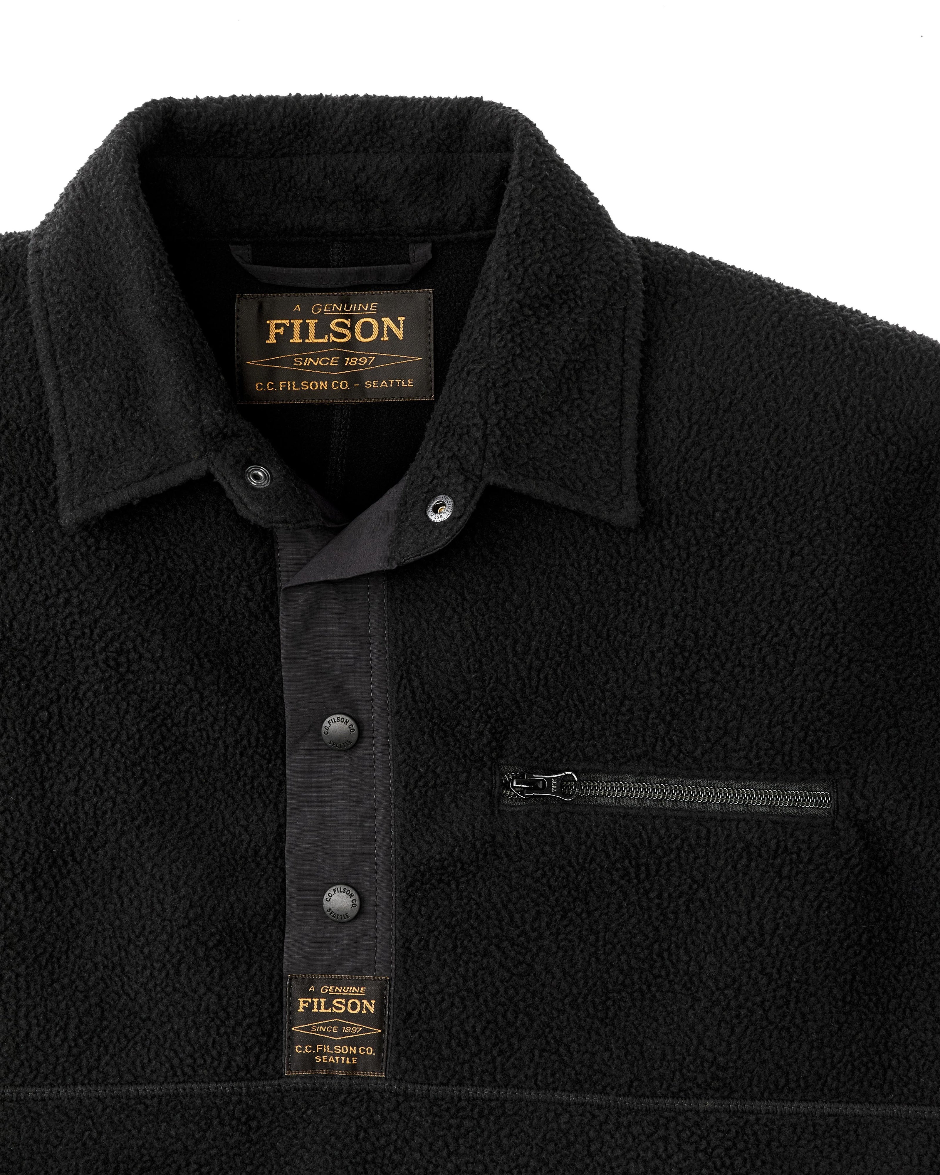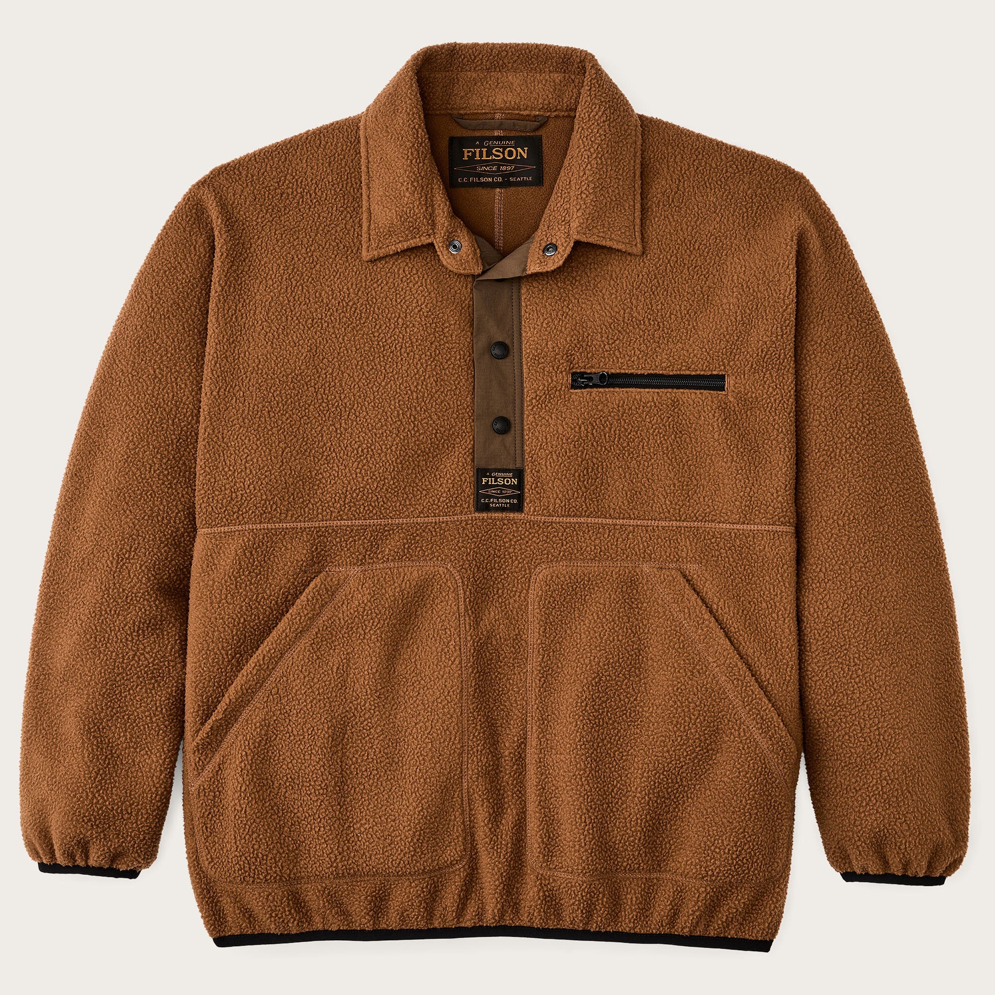 This thick pullover weighs little and excels in heat retention. The high-pile fleece is highly breathable and dries quickly. The snapped front placket extends to the sternum for warmth and ventilation adjustability. Elastic binding on hem and cuffs for a custom fit. Patch-hand and zippered chest pockets.