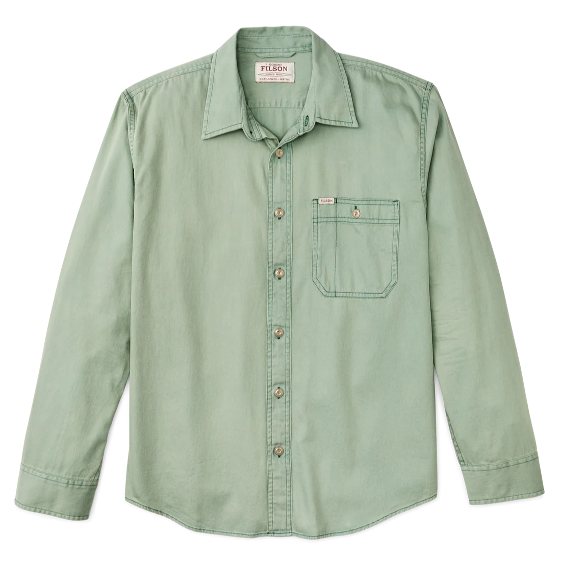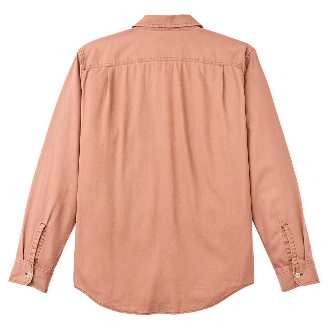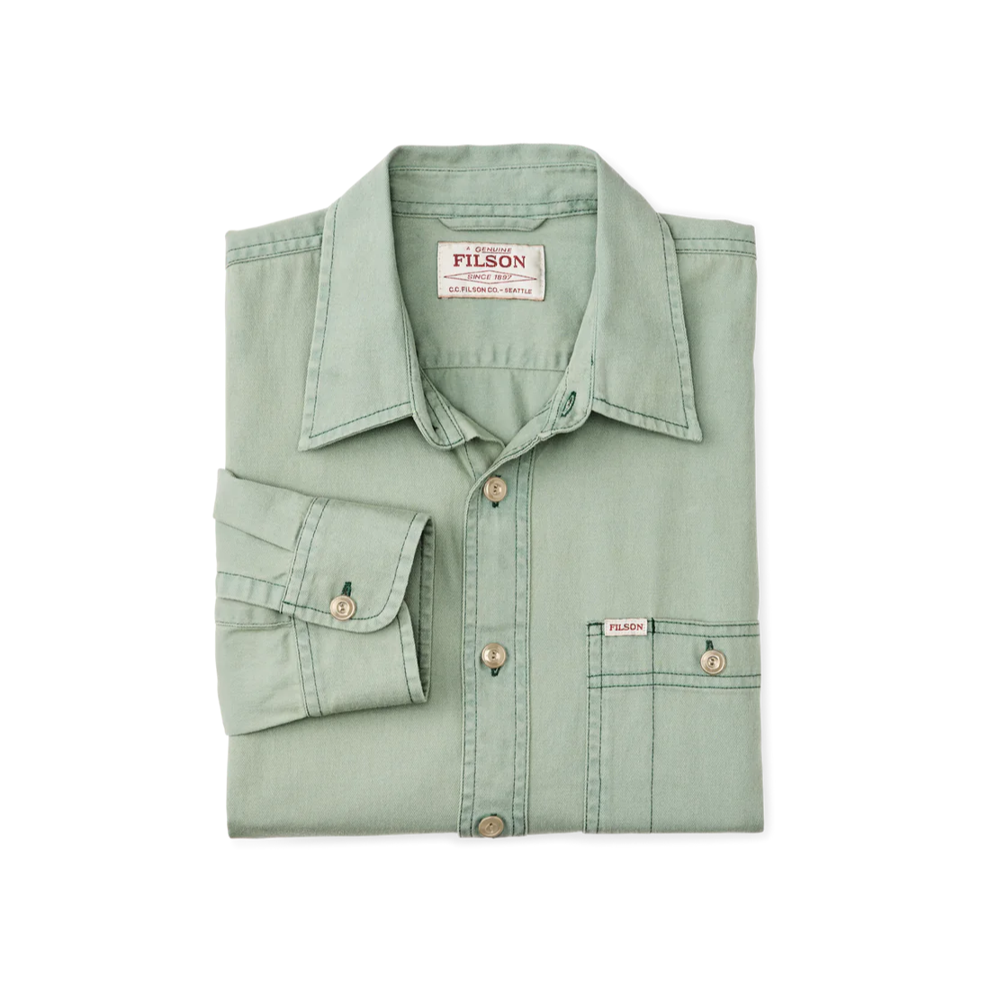 On the docks or in the woodshop, under a waxed jacket or a sweater, this shirt simply works everywhere. The midweight 100% cotton is tightly woven with a faint diagonal rib common to twill fabrics. Dual shoulder pleats provide ease of motion. The left chest pocket is slotted for holding a scribe or carpenter's pencil. Button-front with spread collar.
